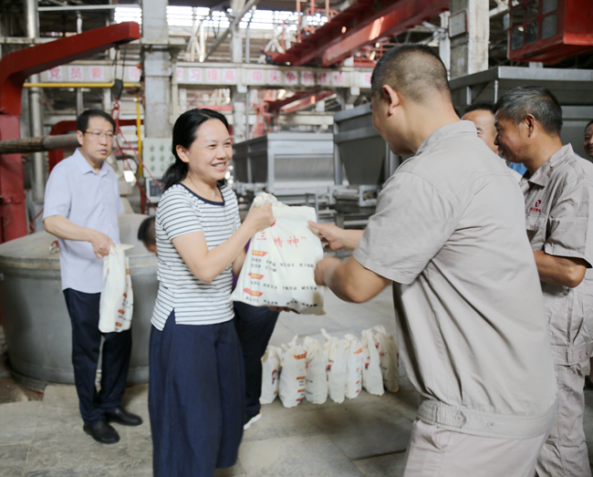 三伏盛夏,熱浪侵襲。8月2日,市政協(xié)黨組書(shū)記、主席黃丹梅來(lái)到車(chē)間,為奮戰在一線(xiàn)的釀造和搬運工人送來(lái)沐浴露、洗手液、洗衣液、毛巾、牙膏等…